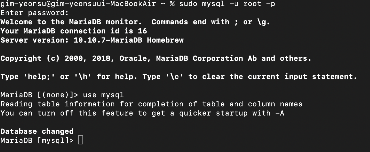 비밀번호 추가한 이후에는 -p를 추가해서 비번 입력후 mysql 접속가능.