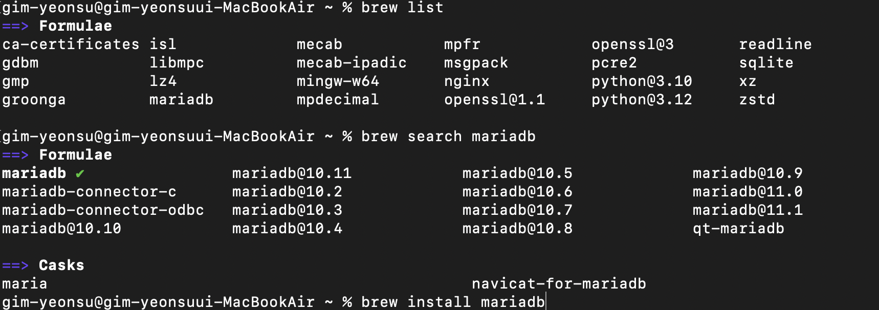 brew search mariadb : mariadb의 버전을 확인할 수 있음